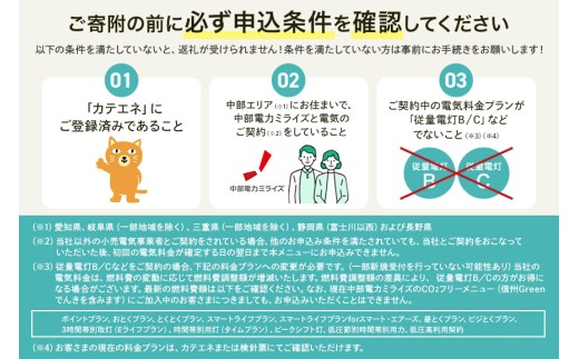 【★★重要★★】 お申込みにあたり、必ず事前に申込条件をご確認ください。 ■何度もお申込み可。 ■お客さまの電気料金へ返礼金額分を充当させていただくのは、返礼開始日から6か月間となります。 申込条件の確認はこちら →https://katene.chuden.jp/clubkatene/move/moveToTaxDonationEntry.do