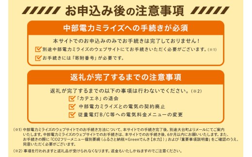 ※2 寄附10,000円(1口分)につき、返礼として3,000円分をお客さまの電気料金の支払いへ充当させていただきますが、ご提供にあたっては、寄附10,000円(1口分)につき500円(非化石証書に基づく料金)を電気料金として申し受けさせていただくため、お客さまの電気料金へ充当される金額は実質2,500円となります。【寄附10,000円(1口分)あたり3,000円-500円】 なお、返礼は中部電力ミライズを通じて行われるため、中部電力ミライズのWEBサイトでお手続きが必要です。