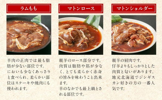 - ■日乃出ジンギスカン食べ比べ5種・・500g(タレ込み)×5種類(マトンロース、マトンショルダー、ラム肩ロース、ラムショルダー、ラムモモ)