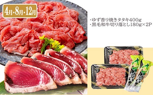 【4月・8月・12月】黒毛和牛切り落とし180g×2P・ゆず香り炭焼かつおたたき400g