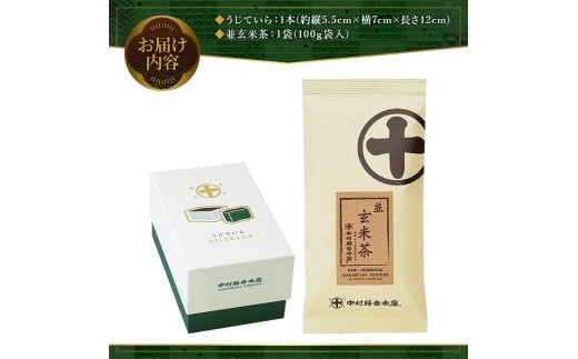 【うじていら】 抹茶で作るかすていらの美味しさを遮ることがないよう、他の素材はごくシンプルなものだけでしっとりと焼き上げた抹茶のかすていら、『うじていら』です。 【並玄米茶】 大きくなった煎茶(柳、番茶に近い)に、玄米をブレンド。 ほどよい苦渋味が香ばしさと合わさり、濃すぎない甘味や苦渋味が広がります。   【保存方法】 ・うじていら:直射日光、高温多湿を避け、25℃以下で保存して下さい。 ・並玄米茶/100g袋入:高温多湿を避け、移り香にご注意ください。 【注意事項】 ※画像はイメージです。予告なく内容に変更がある場合がございます。 ふるさと納税 宇治市 特産品 宇治茶 宇治抹茶 抹茶 玄米茶 スイーツ デザート お菓子 カステラ かすてら セット