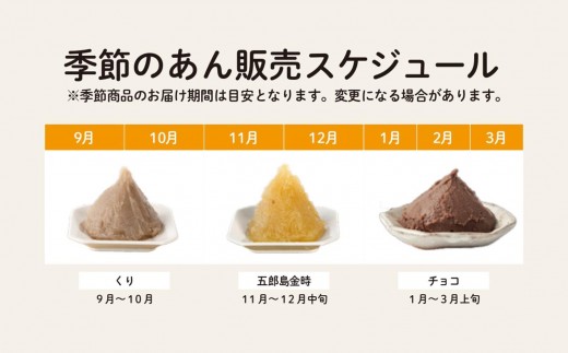 ・現在のお届けは、つぶあんと季節のあん(てんさい糖のくりあん)です。