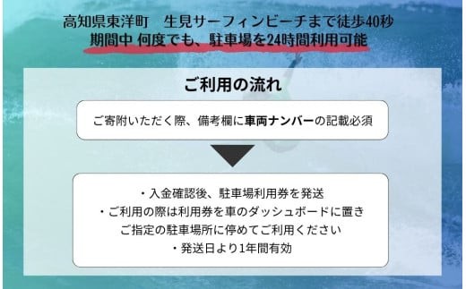 LS001 駐車場年間利用券 高知県東洋町生見サーフィンビーチ 温水コインシャワー完備 水道利用可能