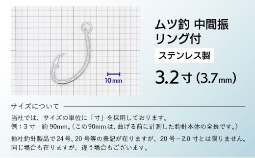 サイズについて 当社では、サイズの単位に「寸」を採用しております。 例えば「3寸」の場合、約90mmになります。この 90mmは、曲げる前に計測した釣針本体の全長です。 他社釣針製品で24号、20号等の表記が在りますが、20号=2.0寸とは限りません、同じ場合も在りますが、違う場合もございます。