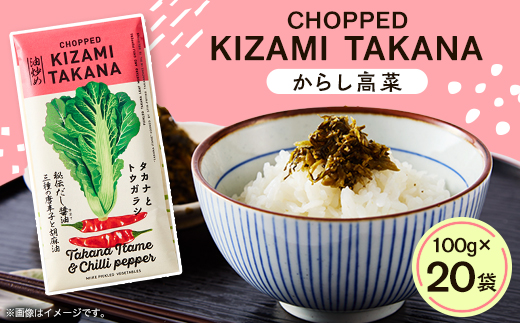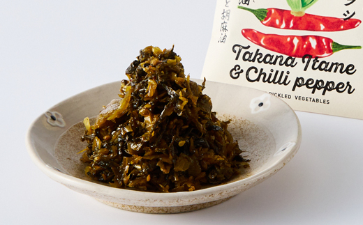 九州産高菜に三種類の唐辛子とごま油を加えて特注の直火釜で炒め、秘伝のだし醤油で仕上げました。 プレーンな味の料理を、高菜の旨味と辛さが引きしめます。 肉料理やスープや麺などにどうぞ。