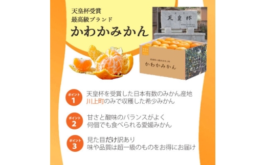 【愛媛県八幡浜市 川上町のみかん限定】 愛媛みかんの名産地・八幡浜市の中でも、 御三家の一角として名高い“川上町”に限定して収穫された特別なみかんです。 この川上地区は、日本農業の最高栄誉「天皇杯」を受賞した、 全国でもわずかな数しか存在しない極上品質の産地。 その中でも選果時にわずかに弾かれた、 味はそのまま・見た目だけ訳ありのものを厳選してお届けします。 味は濃く甘い。かすかな酸味と絶妙なバランス。 ひとつ、またひとつと手が伸びてしまうおいしさです。 品種は、宮川早生と南柑20号となります。 その時期に旬のおいしい品種をお届けいたします。 ※品種はお選びできません。 ※こちらは訳あり品のため、  皮の表面に枝や葉による擦れ、日焼けのあるもの、  大玉小玉などの規格外のサイズ等が入ります。  秀品とは見た目の違いのみで、栽培方法や味は変わりません。 約25個から60個程度ですが、玉の大きさによって前後いたしますのでご了承ください。 ■生産者の声 リアス式海岸の傾斜地に続く段々畑は、 燦燦と降り注ぐ太陽、目の前に臨む穏やかな宇和海に包まれ、 日当たりや水はけが良い栽培環境のため、糖度・酸度が高い「味の濃いみかん」が育ちます。 ■注意事項/その他 ・天候不順等の理由により収穫時期が変動し、発送期間が遅れる場合がございます。 ・長期不在などの理由によりお受け取りが遅れた場合や返礼品を受け取れなかった場合の返品および再配送は致しかねますので予めご了承ください。 ・製品の到着後は、すぐに段ボールから取り出し風通しの良い容器に移し、賞味期限に関係なくお早めにお召し上がり下さい。 ・個数はあくまでも目安となります。玉の大きさにより変動致しますのでご了承ください。 ・傷や汚れのあるものも入ります。 ・画像はイメージです。実際の返礼品とは異なる場合がございますのでご了承ください。 ・品種はお選びできません。