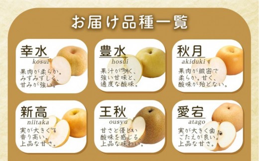 7~8月:幸水・豊水、9月上旬:豊水・あきづき、9月中旬~10月:新高・王秋、11~12月:愛宕