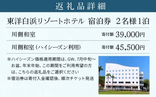 東洋白浜リゾートホテル 宿泊券 川側和室(ハイシーズン利用)