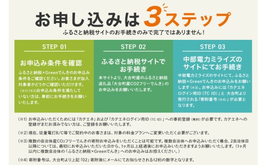 ふるさと納税寄附後、中部電力ミライズWEBサイト(ふるさと納税×Greenでんき)よりお手続きいただく必要がございます。なお、上記のお申込みには、大台町より発行される「寄附番号」が必要となります。
