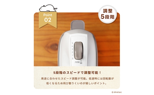 用途に合わせて5段階のスピード調整が可能で、低速時には回転数が低くなるため飛び散りにくく、生クリームの泡立てもらくらく!