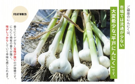 ご縁坐のにんにくは市場では流通が少ない平戸という品種をご提供させていただいております。