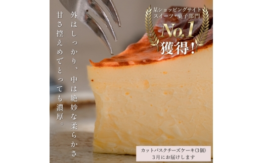 ふるさと納税で大人気、月の宿焼菓子店の作るバスクチーズケーキを含む3種のスイーツを計3回お届けします。