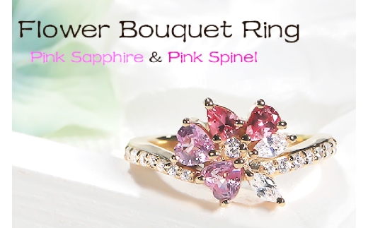 艶やかなK18イエローゴールドに、3種類のジュエル(ピンクサファイア・ピンクスピネル・ダイヤモンド)がきらめくお洒落な花束モチーフリング。