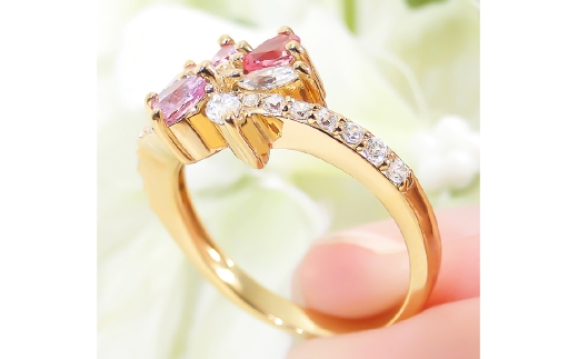 艶やかなK18イエローゴールドに、3種類のジュエル(ピンクサファイア・ピンクスピネル・ダイヤモンド)がきらめくお洒落な花束モチーフリング。