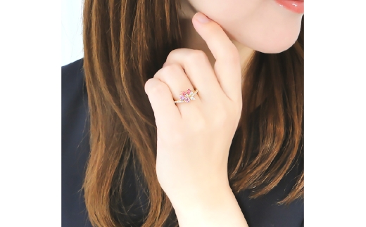 艶やかなK18イエローゴールドに、3種類のジュエル(ピンクサファイア・ピンクスピネル・ダイヤモンド)がきらめくお洒落な花束モチーフリング。