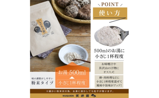 保存料や化学調味料はもちろん、塩も混ぜていません。出汁パックのような袋状ではなく、粉末そのものなので、お使いになる料理によって使用量を調整でき、塩などで味を整えるのもご自身の好みで調整できます。