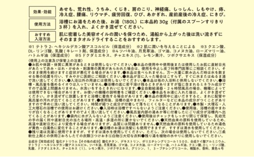 お湯に溶かすとやさしく香りが広がり、湯上がりの肌をなめらかに整えてくれる感覚が楽しめます。
