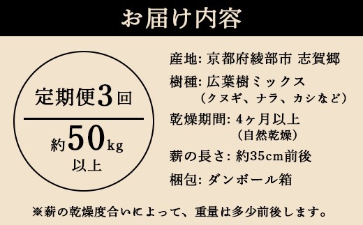 - 【定期便】 薪 広葉樹 ミックス 50kg×3ヶ月 (クヌギ ナラ カシ) | 120余年の歴史が育んだ、炎と人の物語。選ぶことが、京都の美しい森を守る力になる。あなたのアウトドアライフを、もっと豊かに、もっと意義深く。 薪 広葉樹 ミックス 25kg (クヌギ ナラ カシ) 4ヶ月以上しっかり乾燥 焚き火 薪ストーブ キャンプ アウトドア に最適 京都の里山からお届けする高品質な国産薪