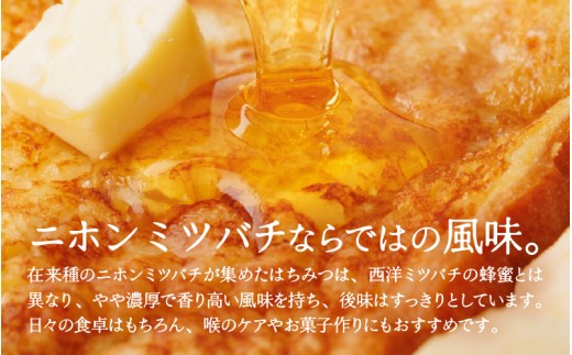 在来種のニホンミツバチが集めたはちみつは、西洋ミツバチの蜂蜜とは異なり、やや濃厚で香り高い風味を持ち、後味はすっきりとしています。日々の食卓はもちろん、喉のケアやお菓子作りにもおすすめです。