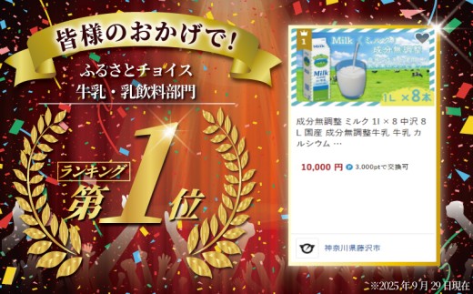 成分無調整 ミルク 1L × 8  中沢 8L 国産 成分無調整牛乳 牛乳 カルシウム 栄養 乳業 朝食 家庭用 給食  健康 紙パック せいにゅう ぎゅうにゅう みるく タンパク質 Milk gyuunyuu  生乳 100% 使用 乳飲料 中沢乳業 神奈川 藤沢市 藤沢 2290205 - 神奈川県藤沢市