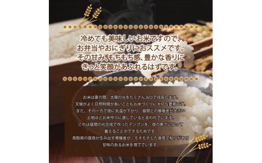 口に含むと、もちっとした弾力のある食感と、噛むほどに広がる優しい甘み。そして奥深い旨味が口いっぱいに広がり、食べるたびに鳥取県の大地と水の恵みを感じられます。冷めても美味しさが損なわれにくく、おにぎりやお弁当にも最適です。