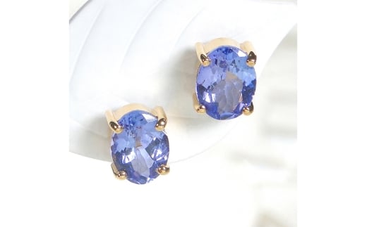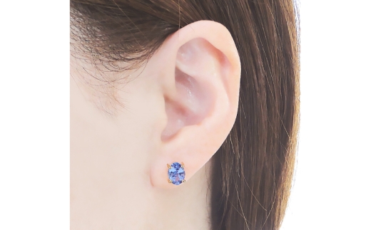 光を受けて輝くオーバルカットの大粒タンザナイトをセットした、K18イエローゴールドベースの一粒スタッドピアス。