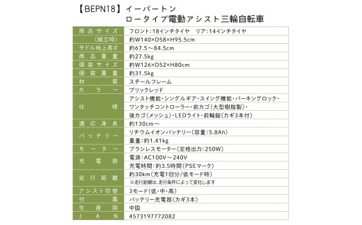 - イーパートン ロータイプ 電動アシスト 三輪自転車 BEPN18|三輪車 大人用 18インチ 3輪 高齢者 シニア カゴ付き 低床サドル ミムゴ CC001