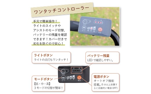 手元で簡単操作!ライトのスイッチやアシストのモード切替、バッテリーの残量を確認できます!カバー付きで劣化を防ぐので安心!