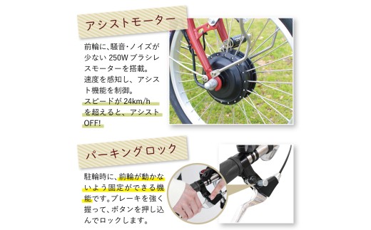 前輪に、騒音・ノイズが少ない250Wブラシレスモーターを搭載。速度を感知し、アシスト機能を制御。スピードが24km/hを超えると、アシストOFF!