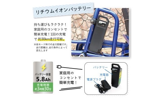 持ち運びもラクラク!家庭用のコンセントで簡単充電!1回の充電で約30km走行可能。