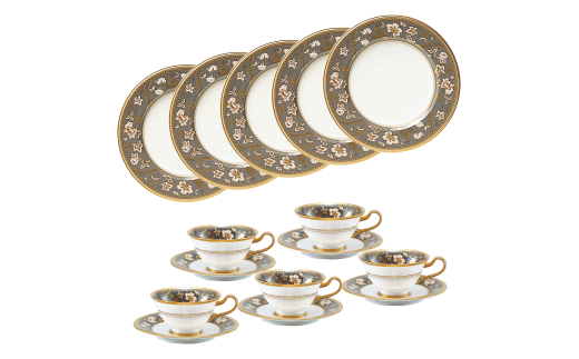 黄昏時の光のような金色に照らされ、ほんのり浮かび上がる花鳥の風雅。日本の伝統的な風物詩である花と鳥をモチーフとして、金色や手差しの半球盛を存分に施した、贅を極めた絵柄です。優雅なティータイムをお楽しみいただける4人用のセットです。