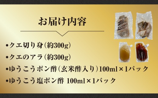 鍋セットには、新鮮なクエの切り身とアラ、長崎県産自慢のゆうこうポン酢2種がセットになっています。