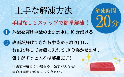 ※本マグロの賞味期限は冷凍1週間ですが、本マグロの最適な保管温度は-60度以下であるため、家庭用冷凍庫の場合、日が経つと変色する可能性が高くなります。できるだけお早めにお召し上がりください。