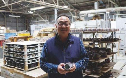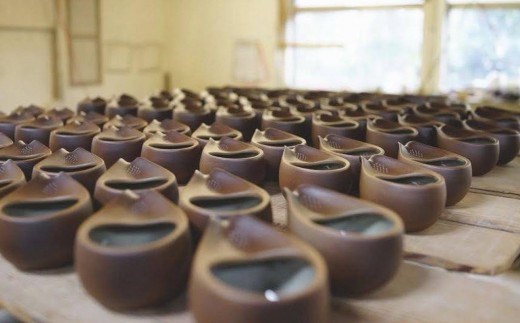 独特の曲線をまとった急須「ひとしずく」は有限会社藤総製陶所の人気商品。急須は萬古焼を代表する商品ですが、デザイン性や機能性の面で、これまでの伝統にとらわれない様々な工夫が施されています。茶器は丁寧な手作業により製造されており、茶こし部分の小さな穴や注ぎ口の「かえし」には、他社には真似のできない職人の技術が光ります。