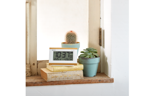 ナチュラルな木目調がインテリアになじむデジタル目覚まし時計です。