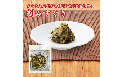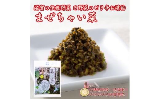 お漬物日本一決定戦、第4回T-1グランプリ全国大会決勝において最優秀賞を受賞。滋賀の伝統野菜日野菜の葉を主体に、日野菜の根・胡瓜・青トマト・青唐辛子・青シソの葉をもとに味わい深く、ピリッとした味に仕上げ胡麻を混ぜた歯ざわりの良いお漬物です。おにぎりにピラフの具材としても最適です。