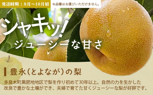 その地で夫婦二人で育てる梨は、甘くてジューシーな味と食感が好評をいただいております。