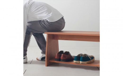 - 座面の下にモノが置けるシェルフベンチ チェリー無垢材 ベンチの他にもパソコンデスクやテレビボーとしても使えます