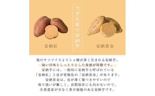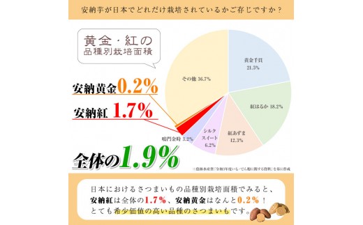 鹿児島県農林水産認証制度K-GAPを取得しており、化学合成された農薬や肥料を低減した取り組みをしております。安納黄金は皮が傷つきやすく取り扱いが難しいため生産農家が少なく希少価値の高い安納芋です。安納紅とは少し違うコクのある甘みをお楽しみください。