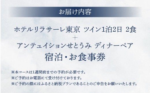 - ホテルリラサーレ東京 ツイン一泊二日二食+アンテュイションせとうみ ディナーペア 宿泊・お食事券