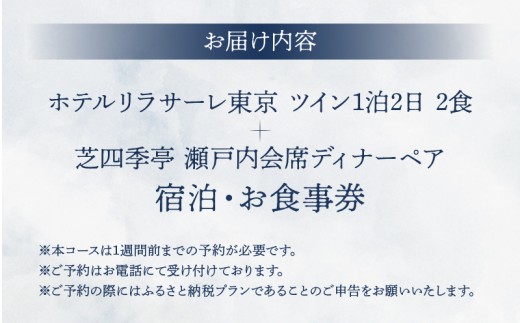 - ホテルリラサーレ東京 ツイン一泊二日二食+芝四季亭 瀬戸内会席ディナーペア 宿泊・お食事券
