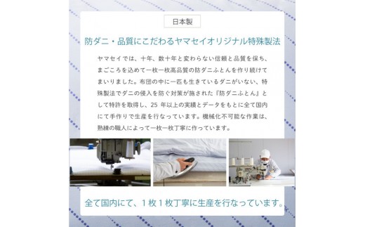 「Drダニゼロック」はヤマセイ独自の製法でダニ対策にこだわって作り上げた、通気性・吸湿性に優れた快適な寝具です。特許製法を用い、熟練の職人が1点1点丁寧に仕上げた寝具は、生きたダニを1匹も通しません。