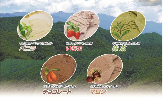 種類はミルクによく合うバニラ、いちご、チョコレート、抹茶、マロンの計5種類です。