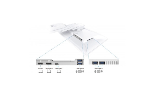 HDMI、DisplayPortに加え、入力端子に70W給電対応のUSB Type-Cを搭載。付属のUSB Type-CケーブルでノートPCと接続すると、映像の表示、音声の再生、USB信号の伝送ができるほか、ノートPCへの給電にも対応しているため、PC用ACアダプタが不要になり、デスク周りの配線がすっきりまとまります。