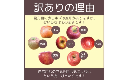 「訳あり品」は、キズや色むら、色薄、へこみ、ツル割れ等の見た目に難があるりんごですが、味は通常のりんごと変わりありません。