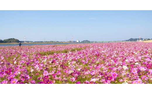「稲作文化の発祥地」として知られる水巻町は福岡県の北部に位置し、面積は11.01平方キロメートルで、東は北九州市に隣接し、西は遠賀川に挟まれた南北に細長い町です。秋には遠賀川のほとりの河川敷公園に、町花の「コスモス」約500万本が全長6キロに渡ってピンクの花を咲かせ、鮮やかに町を彩ります。
