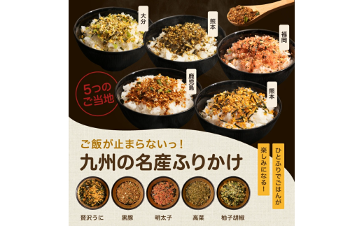 下記ふりかけからランダムで1袋をお届けいたします。 ※ふりかけを指定することはできません。 〇贅沢うにふりかけ  濃厚なうにの旨みが口いっぱいに広がる、贅沢感あふれる逸品。 〇鹿児島黒豚ふりかけ  黒豚の甘みとコクを活かした、香ばしく食欲そそる味わい。 〇博多明太子ふりかけ  ピリッとした辛さと魚卵の旨みがクセになる、博多名物の味。 〇阿蘇高菜ふりかけ  阿蘇の自然が育んだ高菜を使用。食感と風味が特徴。 〇柚子胡椒ふりかけ  柚子の爽やかさとピリ辛の胡椒が絶妙にマッチした、大人の味。 【重要なお願い】 ※画像はイメージです。 ※返礼品の特性上、発送時期が前後する場合がございますのでご了承ください。 ※日付・時間指定の対応ができませんので予めご容赦ください。 ※簡易包装による配送になります。予めご了承ください。