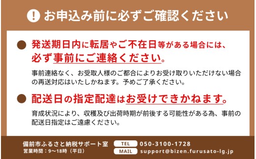 ・天候などの影響により、品質不良が生じ、代替品の対応となりうる可能性がございます。ご了承の上、お申し込みいただきますようお願いします。