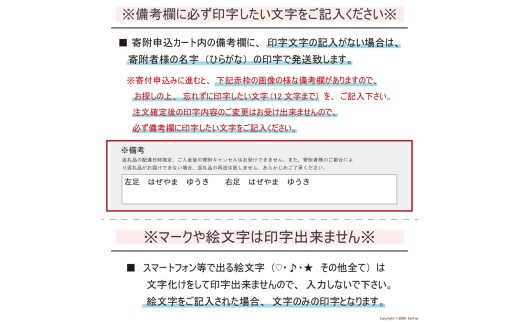 ※マークをご入力いただいた場合、マークの印字ができませんので、ご入力いただきました、お名前・文字のみの印字となります。ご了承くださいますようお願い申し上げます。