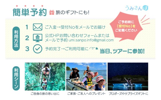 2)ご予約を「うみさんぽ公式HPのお問い合わせフォーム」または、下記メールアドレスへお願いします
